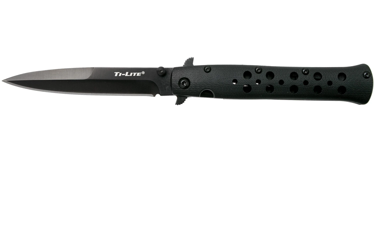 La Cold Steel Ti-Lite es una navaja fina que se puede abrir de varias maneras. Por ejemplo, se puede abrir con el flipper, el perno para el pulgar o el flipper frontal. La hoja está hecha de acero CPM S35VN. Un tipo de acero inoxidable americano. La hoja tiene una forma puntiaguda y fina de punta de lanza. Un diseño realmente clásico. El bloqueo liner-lock garantiza que el cuchillo no se cierre cuando no lo desees.